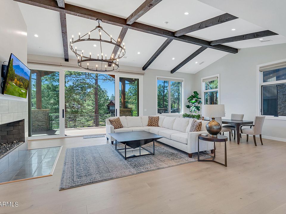 This brand-new Coconino Ridge home is the epitome of true indoor/outdoor living. The open floorplan is perfect for entertaining as the living room, dining area and kitchen flow perfectly together. With wood flooring throughout, exposed wood beams and linear fireplace this home is truly a cozy mountain retreat. The kitchen is a chef's dream with tons of cabinet space, Wolf 6 burner gas range, built-in microwave and island with dishwasher and additional bar seating. The center sliders take you out to the back deck with built-in BBQ and magnificent Ponderosa Pine views. The Primary Bedroom is located on the main level and features and expansive walk-in closet and luxurious bath with dual vanities, stone floor tiled shower, and soaker tub.