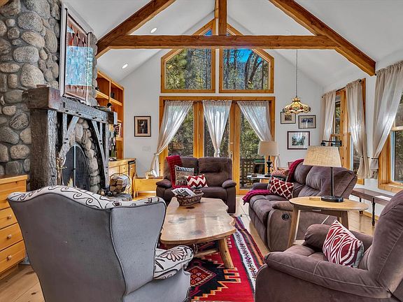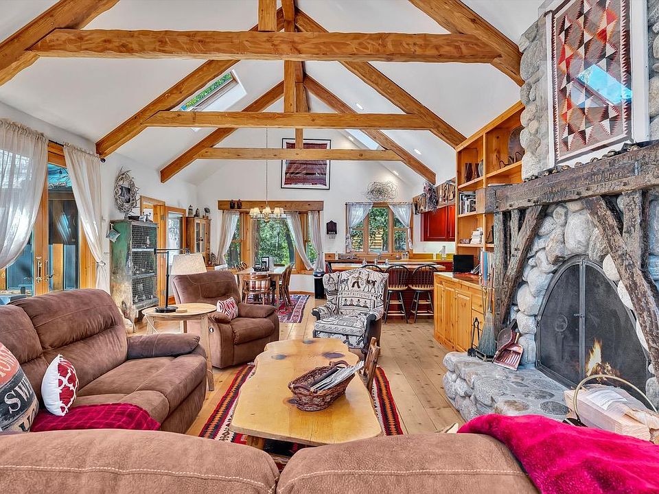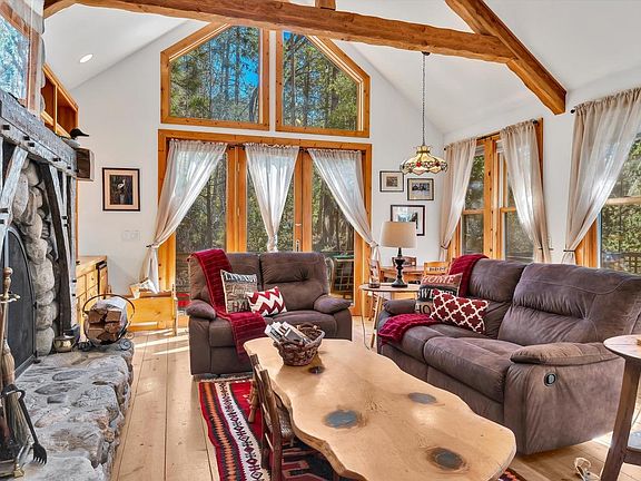 Come and make this dream mountain cabin your year-round home. The front door opens into an adorable mudroom. The left door to the mudroom opens into the main part of the house featuring an open-concept living area with a designer chef's kitchen, a large island and a centerpiece rock fireplace in the large living area with vaulted ceilings, lots of windows, and double doors that lead to the expansive deck that overlooks the creek. The large master suite has beautiful ambient lighting and a window AC unit to stay cool during the summers. On the other side of the mudroom is the laundry room, a kitchenette and small living space and a large upstairs bedrooms. Home to be rented furnished. Tenants responsible for all utilities and fire abatement. Security deposit is 1-2 months rent depending on your credit score. Pet friendly. 3-12 month options available. Rented furnished. Tenant pays for all utilities