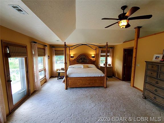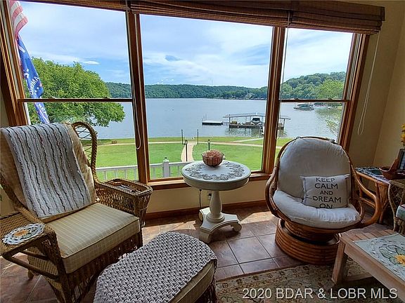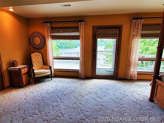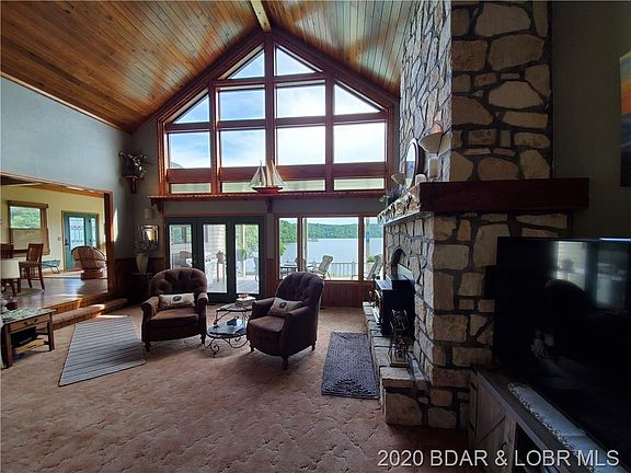 Million dollar view of the Lake from inside or outside this beautiful home. Large covered main deck & wrap around upper deck off the master. Master bedroom with tray ceiling has 2 walk in closets & 2 doors to the master bath which includes: sauna, walk in shower, 2 separate sink areas, stackable washer & dryer, jetted tub, towel warmer & additional closet areas. Upper level walkway is open to wall of windows in living room with floor to ceiling native rock fireplace & pellet stove insert. Large kitchen & dining area. Game room & bar area, a large office lakeside & small office area to view backyard. Private setting on 2 acres on the point includes a garden shed & tool shed with partially fenced backyard, level walk to the dock, 2 walk in step areas & your own boat ramp. This is a one owner home ready for it's next family & the custom woodwork throughout this home is Vintage Lake of the Ozarks, you won't find another package like this. Too much to say, you have to schedule a look today!