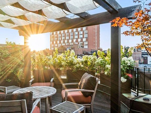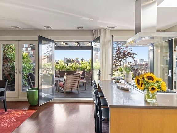 Amazing Indoor Outdoor living in the City! This stunning 3 bedroom, 2.5 bathroom with 2 tandem garage parking blurs the line between indoors and outdoors! Take the direct access elevator up into the unit and you'll notice amazing natural light due to the installation of 3 massive skylights, The desirable open kitchen/ living floor extends on either side with French doors & walk-out terraces. The two 25' wide terraces offer front and back "yards" for fantastic private entertaining. The vast living space includes designated dining for 8. True to the European history of the Back Bay the French doors surrounding the floor leave you with skyline views and sunset. Large master suite includes fireplace, his and her walk-in closets, and large master bath with double vanity, soaking tub. Two other bedrooms allow for flexibility for en-suite guest room and home office or gym. The unit boasts a full laundry room with built in shelving for all of your supplies and linens. Extra storage throughout.
