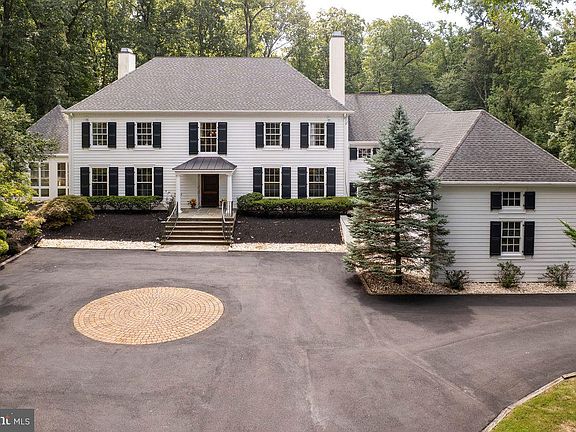 Set on 2.38 acres in the naturally peaceful area known as Princeton Ridge, this stunning home designed by Princeton-educated architect Robert Bennett exudes classic elegance and quiet luxury. Towering trees and sculptural boulders dot the yard for an impactful landscape that’s easy to maintain. A saltwater pool is separately fenced and heated, offering recreation well into the fall. Bluestone decking matches the patios, all of which bask in warm southern exposure. Inside, sun-drenched spaces are positively expansive, including the kitchen, renovated in late 2020 to be a modern chef’s dream with open sightlines into the family room and beyond. Miele appliances surround a tiered island topped with thick quartzite, while a walk-in pantry and a full-sized wine fridge keep everything stylishly organized within easy reach. Tall wood doors accentuate 10-foot ceilings throughout the first floor and fireplaces are warm focal points in both the great room and a versatile office lined with built-ins. In the airy, tray-ceilinged sunroom, floor-to-ceiling windows and French doors highlight a lovely rose garden. Thanks to 3-zone heating and A/C, this favored spot stays as cozy or cool as you’d like, year-round. A new bathroom serves a main level bedroom suite, ideal for guests, while a powder room off the mud entry is handy to the 3-car garage. Catering to modern needs, the laundry room is located upstairs convenient to five more bedrooms and a huge bonus room. The main suite has all the features required of a sumptuous sanctuary: tray ceiling, fireplace, breathtaking views and customized walk-in closets. Honed soapstone details the bathroom, where a magnificent tub is the relaxing centerpiece. Further improvements include many new windows and updated flooring.