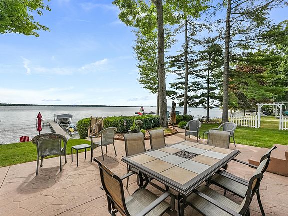 HIGGINS LAKEFRONT, Premier location at Detroit Point. Enjoy the calm waters and gorgeous sunrises along with ideal water depth for boating and swimming. 100 feet of Lake frontage and a great setting with expansive lakeside patios and decks for your outdoor living and entertainment. The home features 5 bedrooms, 2 baths, separate living and family rooms plus spacious kitchen with beautiful lake views from all living areas, fireplace. Very well maintained home and yard, two car garage with additional space on the side, concrete driveway and parking. One of the most desirable locations on Higgins Lake.