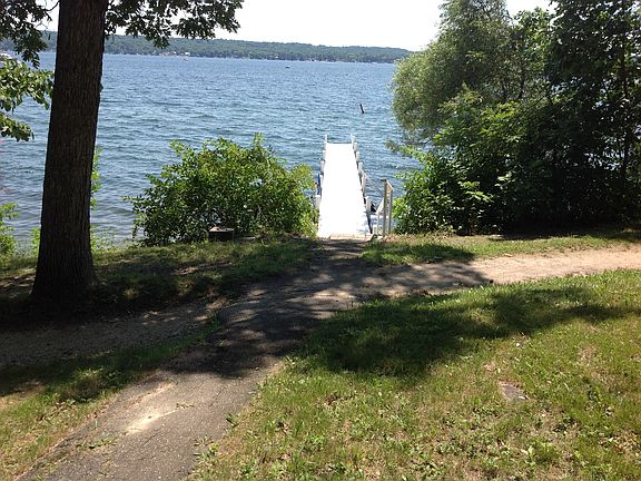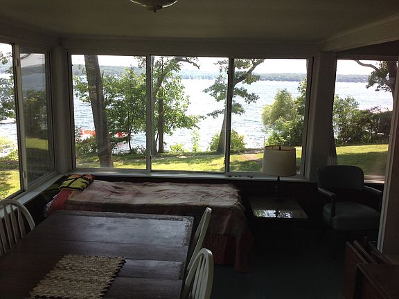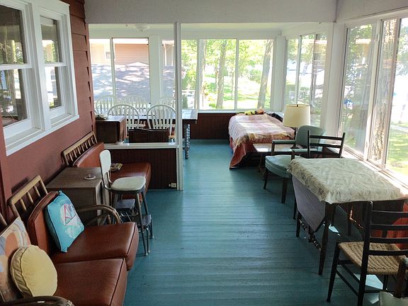 Here's a hard-to-find north shore cottage on 1.4 woodsy acres with 76 feet of Lake Geneva frontage. Reach us by the number at the bottom of the page or at kmzy@aol.com. The property is not only a large parcel compared to neighboring parcels, but it's not part of an association. There's ample parking for up to 7 vehicles and a quaint foot bridge through the woods from the farther parking area. The character of the 4 BR, 1.5 BA summer cottage in this peaceful setting brings you back to a simpler, bygone era. There's a fireplace as well as central A/C and heat. Just outside the bay window on the west side, you are afforded a feeling of privacy from a naturally-vegetated hillside. A glassed-in porch with lake views wraps around two sides, and includes the large dining porch. The basement has a freezer and room for all your tools, storage, and lake toys. The 65 foot pier is a short distance from the house down a gently sloped path. It has a boat landing and a jet ski lift. Walk east on the shore path to have supper in the village of Williams Bay in about 20-25 minutes or head the other direction for 8-10 minutes to George Williams College and take in a summer concert.