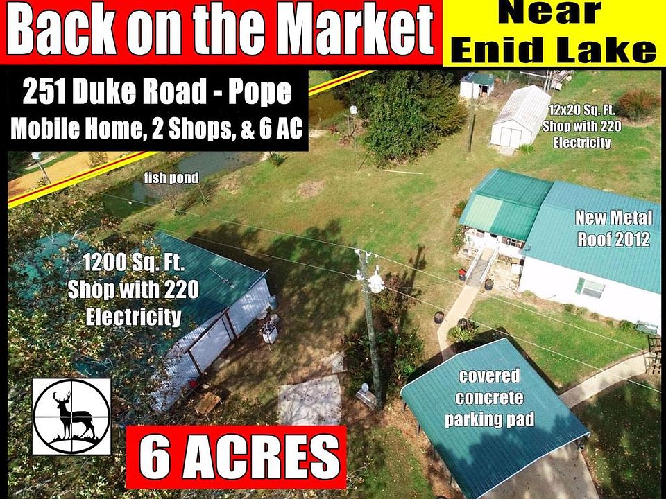 Mobile Home & 2 Shops on 6.4 Acres near Enid Lake ~ Pope School District ~ Hunt in Your Backyard & Enjoy Quiet Country Living! New Metal Roof ~ All New Front Windows! It's the very last home on a dead-end road, so the location is quiet & secluded! New Septic Concrete Treatment Plant & Field Lines - New 4-Ton Central HVAC in 2016 ~ New 4-Ton Central HVAC in 2016 ~ 1200 Sq. Ft. Shop w/ 220 Electricity ~ Smaller Shed is 12 x 20 Sq. Ft. with Electricity & Lights ~ Steel Storm Shelter Installed 2006 ~ W/D/Refrig. Included - This property may not work for all loans --- talk w/your lender.
