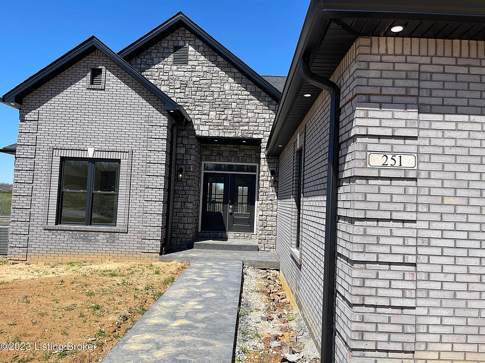 YOU CANNOT BEAT THIS LOCATION FOR CONVENIENCE! This gorgeous brick and stone home is being built on a 1.43 acre lot 2 miles from I-65 off Lincoln Parkway in the new, somewhat secluded Foxwood Subdivision that is on a cul-de-sac and has BBTel high -speed fiber-optic internet. This home has 1,914 sq ft of living space on main floor, has 9-ft ceilings and includes three spacious bedrooms, two full bathrooms, Great Room has trey ceilings, custom kitchen cabinetry, black stainless French door frig with door-in -door, electric smooth-top range, dishwasher, built-in microwave and granite countertops throughout. You will appreciate all the fine details in this home. The primary suite has a trey ceiling; and in the primary bath, you'll find a double vanity with granite countertop, a large soaking tub, a custom tiled shower with glass wall and rain-head. A very spacious custom walk-in closet is near the large laundry room. The basement has 1,600 finished sq ft with 9-foot-tall ceilings, and includes two more bedrooms, a full bath, a family or rec room, and a home office; the rest is left as unfinished potential. HOA Dues are only $200 per year (see attached Restrictions).