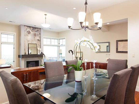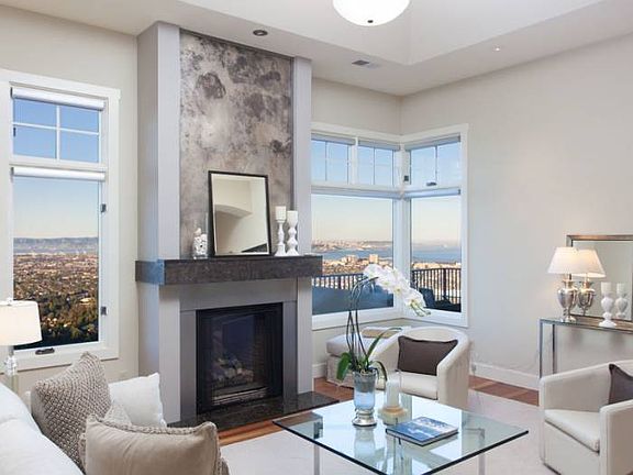 Elaborate dimensions, polished design facets, and extraordinary panoramic Bay and cityscape views distinguish this 2006 contemporary. Three floors of airy living space radiate with state-of-the-art components. Designed with ultra-current lifestyle comforts, conveniences, and splendor in mind, it combines a great-room style kitchen with professional-caliber appliances, public spaces graciously open to one another and to sweeping-view-saturated terraces, a home theater, and five bedrooms, four and a half bathrooms, including an elaborate retreat-like master suite.Nestled in the glorious, green hills of Berkeley at an exalted elevation, the location affords an epic aerial perspective. Yet it remains remarkably accessible. Just moments wending down quiet, gently curving streets populated with mature greenery and distinctive architecture yields public transportation, shopping, entertainment, and dining in nearby neighborhoods, and the renowned Claremont Hotel Club & Spa. Cultivating privacy, the fa ade lies behind an enclosure of suede-like stucco and painted wood, concealing the front courtyard. Hinting at an abundant garden within, a lush spray of sago palm fronds protrudes over the enclosure. The inviting, angular space reveals terraced plant beds and a slate patio in an array of sophisticated sand tones. With access to the kitchen via glass doors, it offers outdoor dining and entertaining options. The front entrance, also accessible from the courtyard, establishes rectilinear focal points that are reiterated to fine effect throughout the interior. The interior entryway conveys a stylized contemporary aesthetic that pervades the home. Expressing it, a cohesive composition of attributes, such as cherry-hued wood flooring, super-tall cinnamon-tone doors inset with geometric detailing and adorned with gleaming, angular hardware, unifies interior spaces. Also throughout: ceilings soar, opulent nature-inspired elements, such as natural-stone slabs and tiles, grace surfaces, and oversized picture windows put views on permanent display, all creating dramatic connection with the outdoors.A triad of doors occupies the fore of the front hall. A powder room sets an elegantly modern tone. It showcases an iridescent glass sink radiating from a contoured stone counter. A closet offers utility. And a bedroom enjoys a separation of space from other quarters and offers exterior access, lending itself well to in-law/au pair possibilities. Within it, a full bathroom displays signature elements consistent in bathrooms throughout the home, such as natural-stone flooring, an expansive natural stone slab countertop above sleek cherry-hued cabinetry adorned with geometric hardware. A combined bathtub and shower displays sand-toned stone tile accented intermittently with small geometric mosaics of textured stone and brushed metal tiles. As the front hall unfurls, another closet offers walk-in coat storage. Adjacent, a wide, floating staircase ascends and descends dramatically. Lustrous wooden handrails top brushed-metal balusters in a bold configuration. Both the upper and lower landings are bathed in light from substantial windows that correspond to the broad spaces. Straight ahead, the dining and living rooms comprise a multi-space framework, open visually to one another, with breathtaking views as the backdrop. The dining room, framed by a swath of counter-height cabinetry, provides sleek, perfectly placed storage for serving pieces. Conveying a lofty effect, the living room sits two steps below and features a tall, tented ceiling above. Flanked by two large-scale windows, a fireplace with natural stone and brushed-metal surround adds contemporary flare. Windows are equipped with electric window coverings, operated via remote control. The open kitchen-family room also presents a conjoined space filled with extravagant views and a plethora of function. Within the kitchen, a massive, ultra-equipped island is widely surrounded by an array of professiona