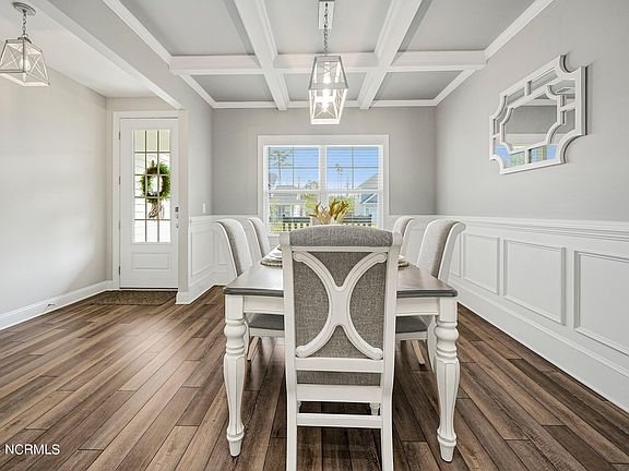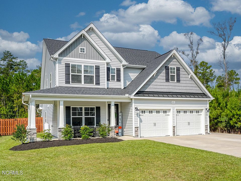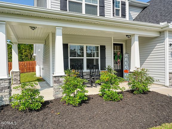 Built in 2021 by Caviness & Cates, this stunning 4 bedroom, 2.5 bathroom home located in the Wylie Branch community boasts major curb appeal with its partial wrap-around front porch and double bay garage. Step inside to find a formal dining room adorned with coffered ceilings and wainscoting. The gorgeous kitchen features granite countertops, gorgeous vented hood, a subway tile backsplash, stainless steel appliances including upgraded gas range, and a bar with overhang seating. The kitchen seamlessly flows into the bright and airy living room, highlighted by vaulted ceilings and a cozy gas log fireplace. The first-floor master suite is a true retreat, complete with tray ceilings, two walk-in closets, and an en-suite bathroom with a tiled walk-in shower. Also on this floor, you'll find a convenient laundry room and a half-bath. Upstairs, a large loft opens up to the living room below, creating a spacious feel. Three additional generously sized bedrooms and one full bathrooms provide ample space for family and guests. Outside, the covered patio and additional patio space are perfect for outdoor entertaining. The fully fenced backyard includes a storage shed and access through a gate in the fence, and the home backs up to serene natural space. Wylie Branch is known for its energy efficiency and tranquil setting, yet it's just a short drive to Wilmington beaches, shopping, and the airport. Don't miss your chance to own this beautiful home!