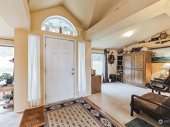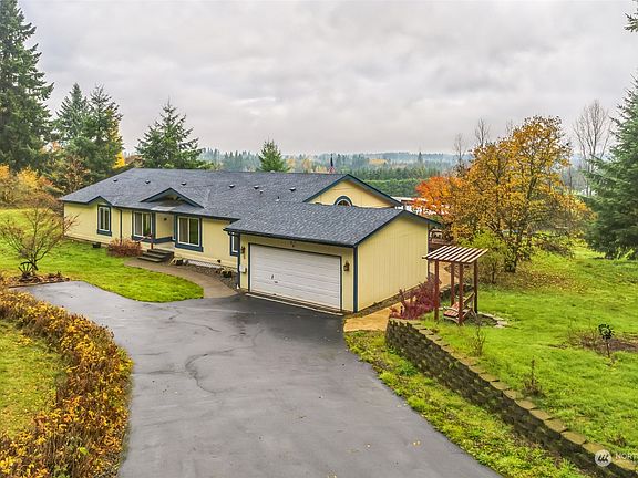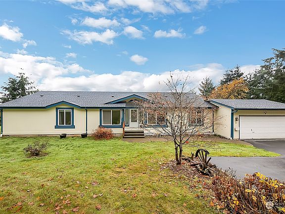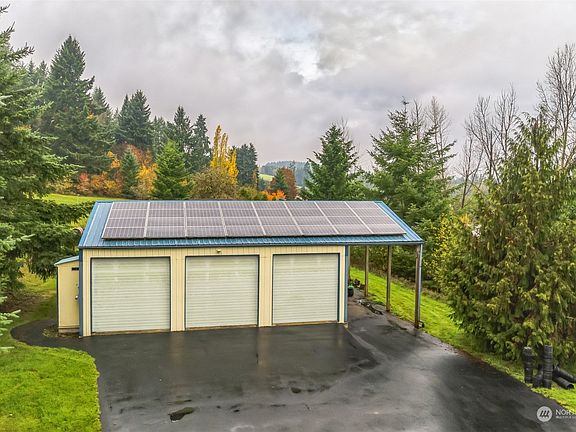 Rare opportunity on a 2600 sf triple wide manuf home on 5+ acres w Mt Rainier view. Central heat/ AC, 2 pellet stoves (one in the primary!) all beds have walk in closets,soaker tub in primary bath and walkin tub in the guest bath. Outside you'll find 2 covered decks,1600 ft blacktop driveway, firepit and rainwater storage tanks. Enjoy large fenced-in orchard w mature fruit trees and garden w blueberry bushes, grape arbor, plum trees, walnut trees and more! Outbuildings are a real bonus of this property:36X48 pole barn w power, shelving, wood burning firepit, an attached covered RV port AND 32 solar panels that power the home. 24X36 woodworking shop w sliding bay door for lg projects/equipment.Outbuildings and shed are also powered by SOLAR!