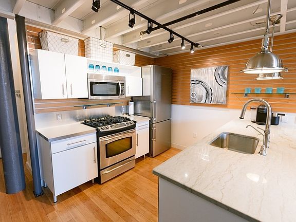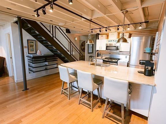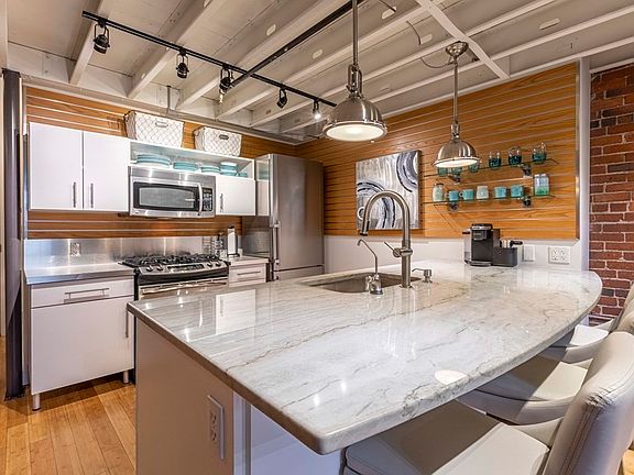This renovated and unique 2BR+/2BA condominium in the historic American Brewery Lofts is a penthouse corner unit which offers an incredibly quiet living environment. Enjoy an abundance of sunlight (SE exposure) and magnificent views from this elevator access loft. Upon entry you're greeted with an exquisite open floor plan, soaring19 foot ceilings, two skylights and an updated kitchen; new stainless steel appliances, oversized breakfast bar with granite countertops, and reverse osmosis water filtration system. A massive pantry with a second fridge and ample storage can act as an office space. The new bamboo floors, exposed brick and large windows compliment the industrial design. The central air conditioning, walk in closets and private roof rights for your own private outdoor oasis truly make this home one of a kind. Included in this on-site professionally managed building is a gym, courtyard with two gas grills, private GARAGE parking, 3 guest parking, and locked basement storage.