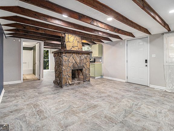 Step inside this beautifully updated 3-bedroom, 1.5-bath home featuring warm wood-beamed ceilings and a stunning double-sided stone fireplace that connects the cozy living room to the stylish kitchen. The home offers LVP flooring throughout, fresh interior and exterior paint, and updated vanities and countertops that give it a modern, move-in-ready feel. Enjoy peaceful mornings or evening gatherings on the inviting wrap-around front porch, and take advantage of the fully fenced backyard-perfect for pets, play, or entertaining. All of this on a single story, conveniently located close to shopping, dining, and all that downtown Griffin has to offer.