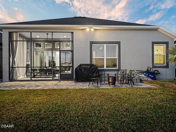 The heart of this home is the open-concept living, dining, and kitchen area, which exudes warmth and charm with its classic black-and-white motif. Natural light floods the space, creating an inviting atmosphere for entertaining or simply relaxing. Sliding glass doors lead to a gorgeous covered and screened lanai, where you can enjoy serene water views while hosting guests or savoring your morning coffee. Step outside to discover a beautifully landscaped backyard with a gray paver patio and fenced-in yard, extending your outdoor living possibilities. Whether you're grilling, gardening, or just soaking up the Florida sunshine, this backyard is ready for your enjoyment.