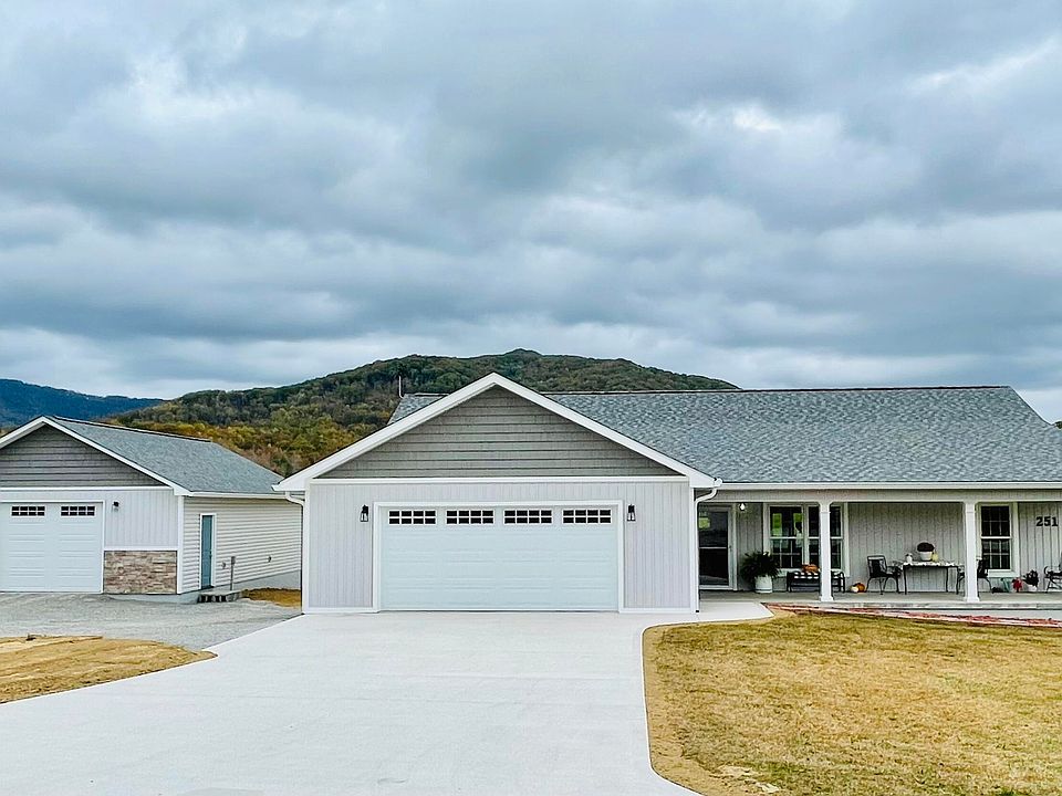 BEAUTIFUL CUSTOM HOME with breathtaking views! This home also boasts a stunning custom garage as well! It's the only one of its kind in the neighborhood! Such craftsmanship and heart given to every detail throughout both! Open concept floor plan is perfect for entertaining. The large kitchen island would be perfect for all of your holiday gatherings! The split bedroom design gives ample privacy to the primary suite which boasts a large walk-in closet and bath. Not a single step in this one either! Completely level flooring from exterior to interior if steps are an inconvenience for you. The primary and back secondary bedrooms feature no-grid windows so you can wake up to the stunning mountain views. So peaceful! Enjoy your morning coffee in a rocker on the front porch or your family cookout on the back deck. All kitchen appliances remain, including the refrigerator. Mud room off from the garage and laundry room with utility sink are a bonus too! The possibilities are endless with this beauty. Built in 2023, everything is like new so the owner/builder will not be making any updates, changes, repairs or improvements. Call for your showing today! Don't miss this one!