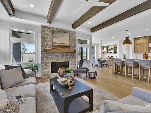 Clearwater Model | Blackrock Homes. Professionally decorated model home in a prime Eagle location! This luxury single-level features an open floor plan with custom “Weathered Oak” cabinetry, quartz island, Bosch appliances (including wine fridge), and a spacious walk-in pantry. Private primary suite includes dual vanities, soaking tub, and oversized walk-in closet. Huge garage w/ a boat/trailer bay measuring 45 ft + 7x14 shop space. Fully landscaped and fenced yard. Community amenities include pickleball courts, dog park, and future POOL (2026). Close to Downtown Eagle, Boise River, Greenbelt, and Foothills. Furnishings not included.