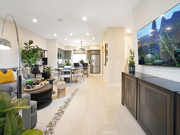 modern light fixtures, a flat screen TV, stained wooden cabinetry throughout and much more! The chef's kitchen boasts quartz counters, full height tile splash, a large island for extra seating, pantry and stainless steel appliances including Samsung Stainless 3-Door French Door Refrigerator. Off the kitchen is a dining room and great room with a private balcony for dining alfresco. Upstairs on the third floor are three generous sized bedrooms, including a primary suite with walk in closet, custom wallpaper, designer light fixture and drapes and spa-like bathroom with framed mirror, tile surround at shower with glass enclosure, quartz counters and tile splash at the dual sink. The secondary bedrooms include custom wallpaper or decals, drapes, and a shared bath with decorate tile and upgraded counter at the sink. Downstairs on the first floor enjoy a fourth bedroom with a gorgeous wall treatment and bathroom with custom paint and framed mirror. The first floor bedroom is the perfect space for children, guests, a den, home gym, or home office. Home-shoppers will also appreciate the laundry room including the side-by-side Samsung washer and dryer, and 2-car side by side garage, surface mount LED can lighting, and ceiling mount music speakers with wall volume control. Smart home features include Brilliant Home Control (giving you touch and voice control over lighting, climate, cameras, music, intercom and more), Ring Video doorbell, a smart thermostat and smart lock at entry door. This gorgeous home is one of 59 brand new townhomes built in the intimate neighborhood called Townes at Magnolia by Melia Homes. Tour today and take advantage of all that this home has to offer!