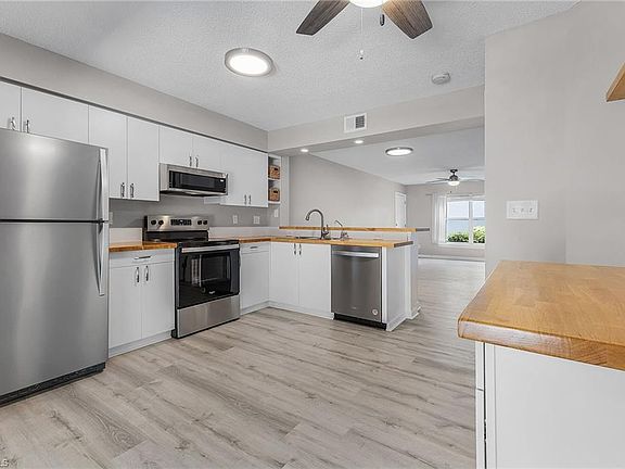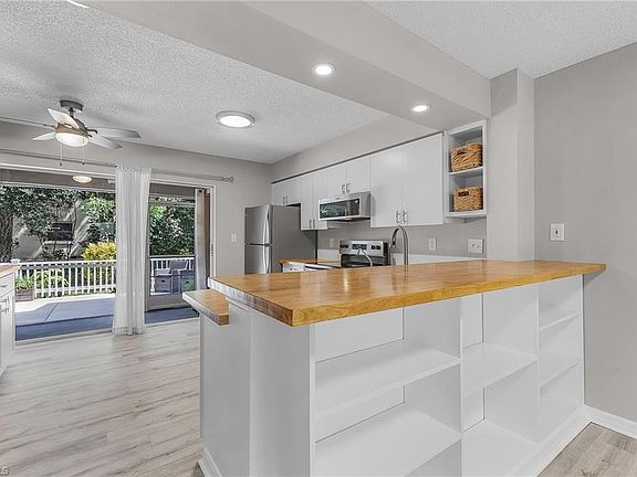 Impressive RENOVATED 2 bedroom 2 bath First-floor, End-Unit Condo, with golf course views in the Veranda's at Quail Run. The kitchen is complete with NEW stainless steel appliances, butcher block countertops, cabinets, recess lighting & Kohler sink. The Primary bedroom includes an ensuite bathroom, a walk-in closet, custom shelving, and access to the covered, screened-in lanai. Both renovated bathrooms have NEW walk-in showers, tiled floors, vanities, Kohler sinks & toilets, lighting, mirrors & tailored shelving. Brand new flooring & window treatments, throughout the unit, round out the upgrades. Note the split bedrooms & washer/dryer in the unit. Check out the scenic views from the large, charming patio, designed with a quaint fence & built-in flower pots. (Outdoor furniture & grill can remain at buyer's convenience.) Just a short walk to the Community Pool...Low condo fees...2021 HVAC, 2018 Roof, & one assigned parking spot. Guest parking is available... Fabulous location, centrally located in Naples, minutes to SW Florida's beautiful beaches, and a short drive to scenic 5th Avenue or Mercato. Schedule a showing to see this delightful condo. It's definitely one you don't want to miss.
