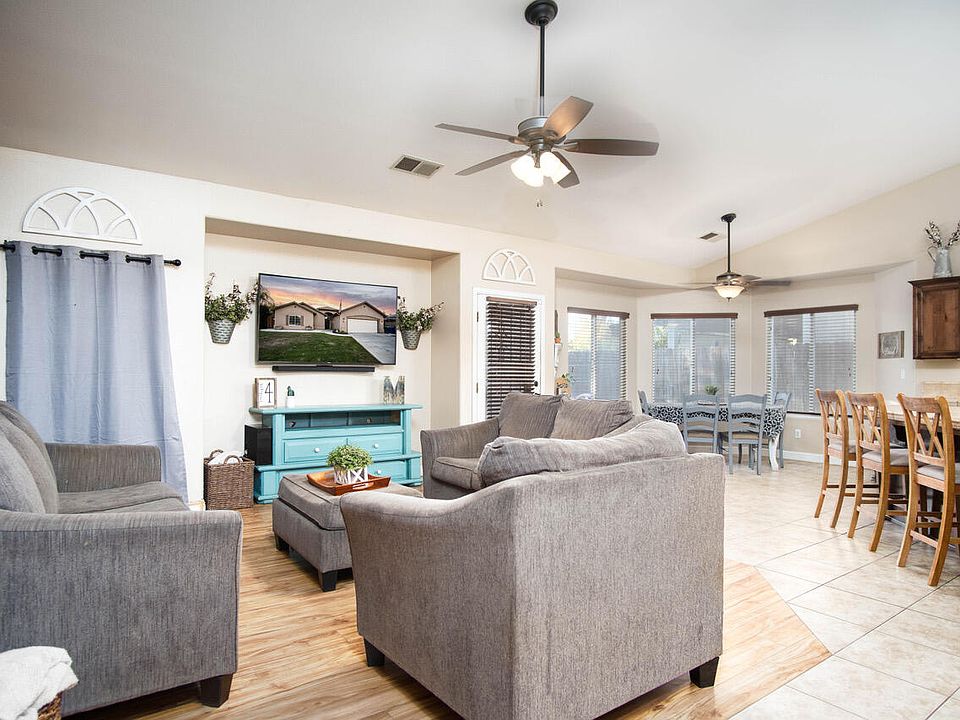 Don't miss this beautiful, lovingly cared for home with 3 bedrooms, 2 baths and convenient tech area! The living area with designer-wood wall, laminate flooring and vaulted ceiling is open to the dining and kitchen with large breakfast counter. This home is located on a quiet cul-de-sac close to schools, church and shopping. There is a large patio, new HVAC system and playstructure. Each bedroom has a walk-in closet. The kitchen features under-cabinet lighting, tile flooring and upgraded cabinetry.