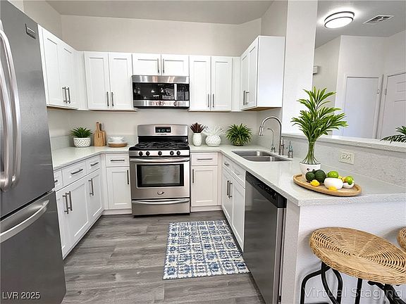 First time on the market - the premier Henderson lifestyle living community in the heart of Green Valley Ranch and the District. Impeccably updated and upgraded interior with luxury plank flooring, dual tone paint. Awesome natural light everywhere compliments the udpated lighting as well. Upgraded modern kitchen with quartz counters, white cabinets, stainless appliances. Upstairs find upgraded textured carpet in both bedrooms. Both hall and primary baths are updated/upgraded as well. Walk-in closet in primary bedroom too! Patio on the east side - enjoy moring coffee in the morning sun or afternoons in the shade. Direct access garage. Gated complex offers multiple pools including a resort style pool at the clubhouse with gym. Walk across the street to the District or across the other street to Lee's Family Forum. Enjoy miles of paths and multiple parks. There is no better location in the city. Sale subject to existing lease ending March 31, 2026