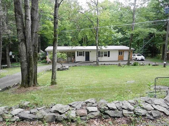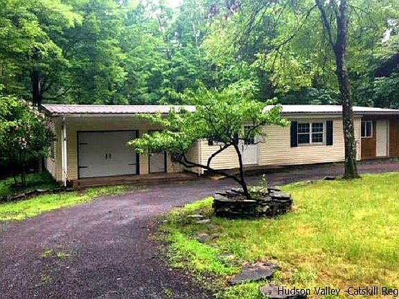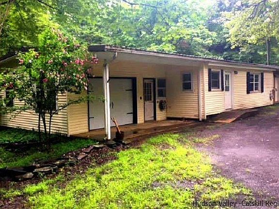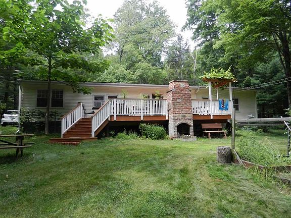 Be Wowed when you go in - this Ranch home has been miraculously redone inside and will delight your senses! Brand new kitchen sparkles with dynamic concrete counter & lighting. The kitchen is fully open to a spacious living room with gleaming hardwood floors and a pellet stove. A great modern look! A second "front door" in a cedar shake addition leads to a most useful mudroom. There are 3 bedrooms - One with it's own half bath and another with it's own nursery or Office. Baths have been updated and all rooms have been freshly painted. Large deck overlooks the 6 plus acres of woods and lawn that go way back. Two unusual outdoor fireplaces (as is condition) and a tree fort lend fun aspects to this home & surroundings. An oversize garage / workshop and large newer shed provides ample storage.