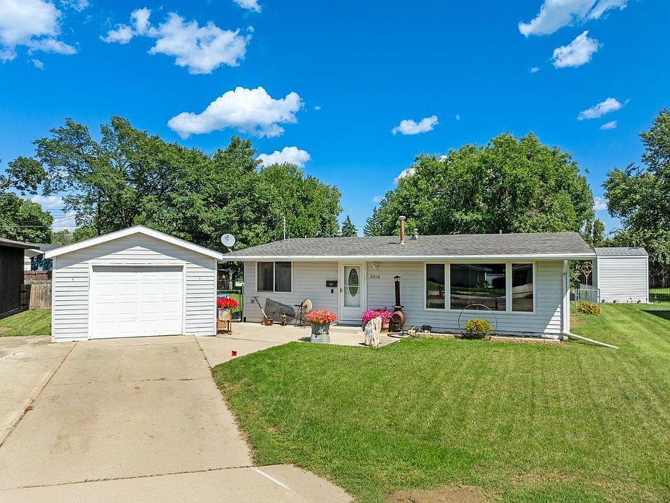 Welcome home to this beautiful ranch style home set on a large lot in an established neighborhood with mature trees in SW Minot. The main floor with vaulted ceilings features 2 bedrooms and 1 bath and an empty canvas in the large unfinished basement. The living room is large with vaulted ceilings and a HUGE window that creates a lot of natural light. The kitchen has been updated, it has ample storage, a pantry and wood cabinets. The dining room has a sliding door leading out to the deck and LARGE backyard. The primary bedroom is large, and the second bedroom is nice sized. Finishing off the main floor is 3/4 bath. Downstairs you will find an empty canvas and the laundry room with a washer and dryer that will stay. Outside you will find an oversized 1 stall garage and a 12x12 shed. The house is on a beautiful, lush lot. This home is a must see!!!! *New sewer line September 2025