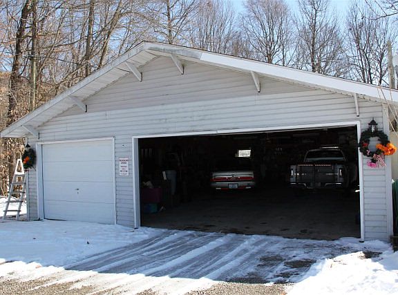 1800+SF, 1.63 acres, 6-car garage (3 wide/2 deep) with oil change pit. Spacious home surrounded by woods on 3 sides, farm land across the road. Home has a large open living area w/FP, lots of kitchen cabinets/counter top space/appliances incld. Walk-in utility room includes washer/dryer. All 3 BR's have walk-in closets. Screened in back porch w/hot tub!