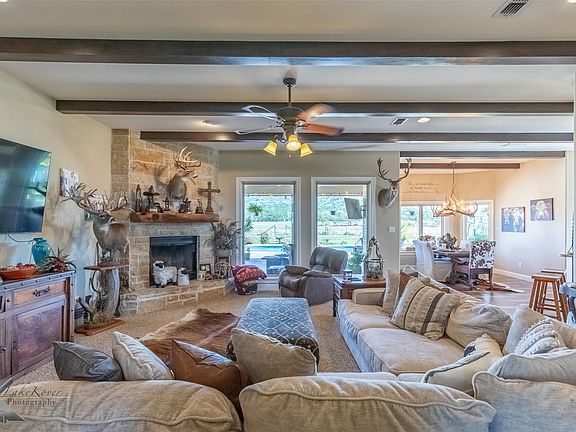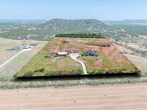 Experience country living with modern luxury in this stunning custom-built 4-bedroom, 2.5-bath home on 15 acres in highly sought-after Jim Ned ISD. This beautifully designed property offers a split bedroom floor plan and an open-concept living area featuring a cozy wood-burning fireplace and expansive windows along the back of the home, showcasing amazing countryside views and flooding the space with natural light. The home boasts granite countertops throughout, a spacious kitchen perfect for entertaining, and a luxurious primary suite with a sitting area, dual sinks, soaking tub, tiled shower, and a large wrap-around walk-in closet. The laundry room includes a mudroom area, sink, and extra storage for added functionality.