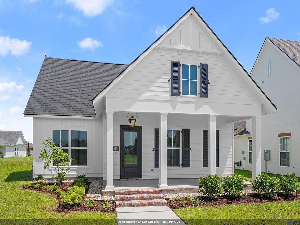 Chicot b plan by Level Homes in Water’s Edge at Lexington Estates! The Chicot is a one-story home with three bedrooms, two full baths and just over 1760 square feet of living space. Enter this home from the brick steps onto the large, covered porch with columns and hanging gas lantern into the spacious living room. The living room is centered around a vent-less gas fireplace with a Pure White quartz surround and is open to the dining and kitchen. The gourmet kitchen features custom painted cabinets with under cabinet lighting and 5" hardware pulls, large center island with a single basin granite composite sink and over hanging pendant lights, 3cm Pure Calacatta Nebula countertops, white craft gloss subway tile backsplash, stainless appliance package including gas cooktop with a custom hood vent and a walk-in corner pantry. French doors open from the dining room onto the large, covered side porch which is perfect for entertaining! The master suite is located at the rear of the home and features a spa like master bath with dual vanities, Pure White countertops and custom framed mirrors, a separate tub and job built tiled shower with a seamless glass enclosure, a private water closet, a separate linen closet and a walk-in closet! Bedrooms two and three are located at the front of the home both with ample closet space and share a hall bath. Vinyl wood flooring throughout all open living areas and bedrooms and 12”x24” tile throughout all wet areas. There is a walk-in laundry room with a built-in double wall cabinet and a mud room with space for an "optional" built in mud bench located off the garage entry. The Yard is professionally landscaped and fully sodded! HOME IS MOVE IN READY!! The Water's Edge section of Lexington Estates is gated and Level Homes has 16 different floorplans to choose from with a mixture of front load garages and alley loaded garages. Other lots/plans available.