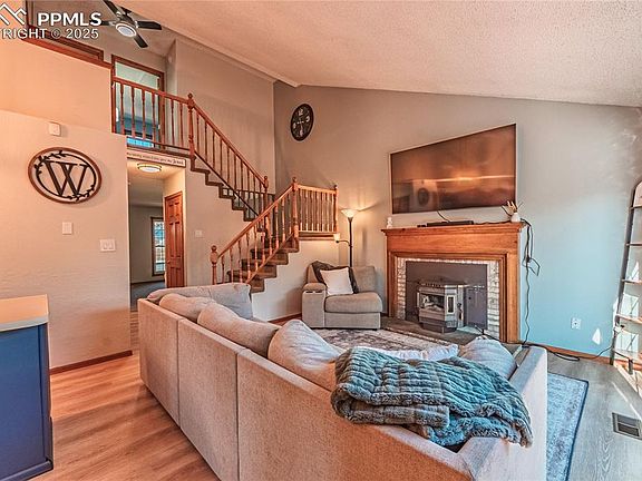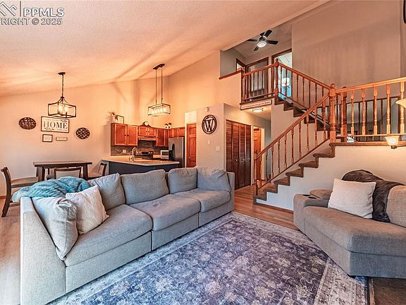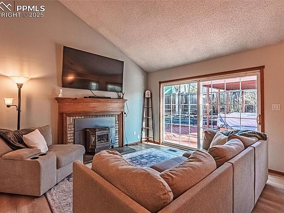 Located on a quiet culdesac, this spacious home sitting on a large lot is ready for all of your summer plans! Custom blackout shades in all bedrooms, a wonderful pellet stove in the family room, stainless steel appliances, privacy fenced backyard, 3 storage sheds (2 have electricity and lofts). Laundry and a bedroom/office on the main level. This home has an open and airy floor plan with vaulted ceilings creating a spacious and inviting atmosphere. ***New HVAC + whole house humidifier in 2023 (new A/C!). Ducts cleaned & dryer fumigation replaced in 2024. New roof in 2019, new light fixtures throughout, Hot tub (may need pipe repair). Extra storage space in garage and under stairs. Front yard is xeriscaped and the .20 acre lot/backyard is ready for entertaining with a 460 sq ft freshly painted deck. Conveniently located near military bases, shopping, parks and quick access to I25.