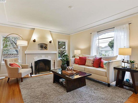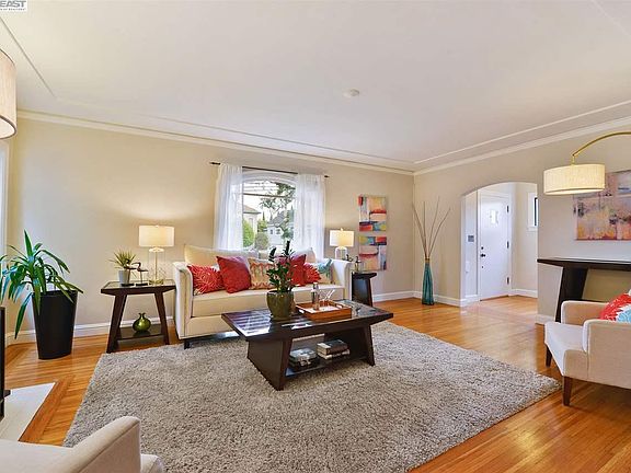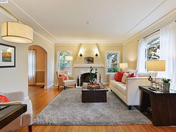 Gorgeous East End home. Lovely and light-filled, with spacious rooms and Art Deco era architectural features. Hardwood floors, classic fireplace with keystone detail. Sunny breakfast room with bay window. Formal dining room has gracious archway, chair rail and elegant period-style chandelier. Split-level floor plan with one bedroom on first level. Two-car attached garage with shop space and laundry area. Large, sunny yard faces tree-lined street and offers ample patio area and mature plantings. Super location close to Park Street and one block from the beach. Walk Score rating of 79: "Very Walkable". Near top schools, parks, shopping and transportation to San Francisco.