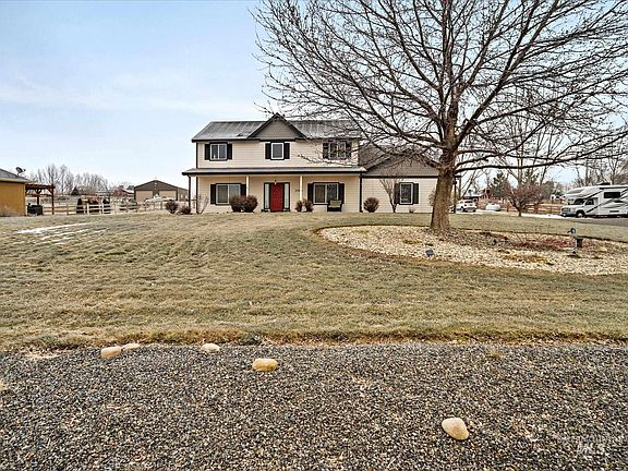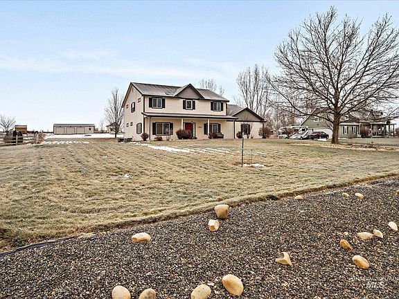 Welcome to a peaceful setting in a great location with opportunity for self-sustainability and fast access to I-84. Lies on 1.25 manicured acres & has a charming covered front porch. An open layout & plenty of natural light, featuring beautiful hardwood floors, open kitchen w/pantry, island w/breakfast bar, & rich wood cabinetry. Both full baths offer dual vanities with master bath offering soaking tub. Both front and back covered patios for enjoying beautiful sunrises and sunsets. Did I mention property has a huge shed and new 26x51 shop! Move-in condition and ready for new owners.