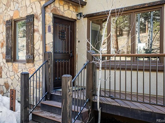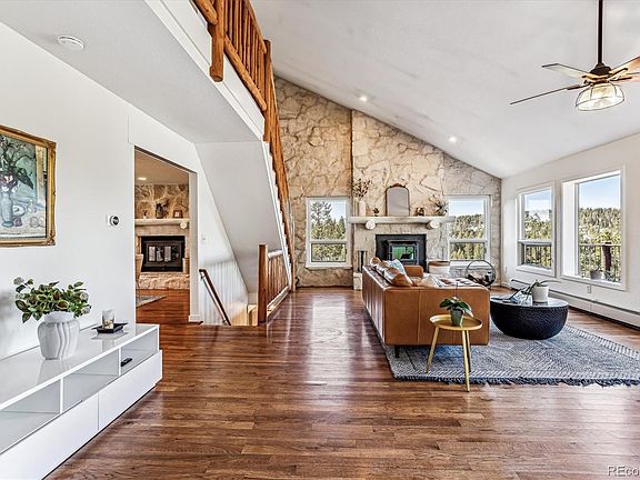 Welcome to your mountain sanctuary nestled on a cul-de-sac in the breathtaking Evergreen community. This picturesque retreat offers awe-inspiring views of Mt Blue Sky snow-capped peaks that stretch as far as the eye can see. Approach this updated haven and be greeted by the charm of new stone and stucco exterior, enhancing the home's curb appeal. A spacious new Trex deck invites you to soak in the crisp mountain air while enjoying your morning coffee. The spacious great room is adorned with vaulted ceilings, creating an airy and inviting ambiance. The wall of windows bring in an abundance of natural light while framing the stunning mountain views. The home boasts an updated kitchen, perfect for culinary adventures, with stainless steel appliances and an island providing ample counter space for meal prep. There's lots of storage with an abundance of cupboards and a walk in pantry. Retreat to the primary bedroom, where you'll find a full bathroom complete with a shower and jetted soaking tub, heated floors, granite counters and double sinks. The walk-in closet is thoughtfully designed with a custom California Closet organization system. The lower level of the home has a beautifully updated bathroom for the two guest bedrooms to share. There is also a bonus room with a full wet bar and wine fridge, perfect for entertaining. There's a nook full of natural light that is a great place for a home office or to get creative with an easel and paint. For furry family members, a fenced yard awaits, offering a safe and secure space to roam and play. Additionally, a large shed provides convenient storage for outdoor gear, ensuring that all your mountain essentials are within reach. Located just a stone's throw away from downtown Evergreen, convenience is at your fingertips. Enjoy the vibrant atmosphere, explore charming local boutiques, indulge in delectable dining options and traverse endless trails on foot or bike, all within a short distance from your new sanctuary.