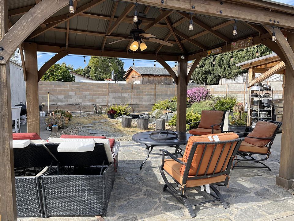 Enjoy indoor / outdoor living from this beautifully renovated and well maintained single-level home with four bedrooms, two bathrooms, gourmet kitchen, and gorgeous outdoor escape. The bedrooms are separated, allowing for privacy, with the master bedroom suite tucked away in the back of the home. The open living and dining area is recessed from the kitchen, offering a feeling of togetherness with some compartmentalization. Host amazing blow out parties or intimate gatherings in the gorgeous backyard oasis, complete with koi pond, outdoor kitchen, gazebo, studio shed with sliding glass door and windows, and 2-car garage that can serve as a perfect workshop. There is plenty of on-site parking, with enough space to store a camper or RV. This move-in ready home exudes pride in ownership and will be stress-free for the new owners, dual-paned windows, new air conditioning system, and leased solar system.