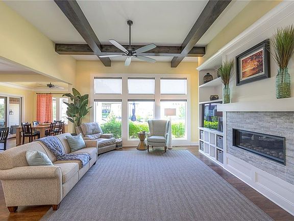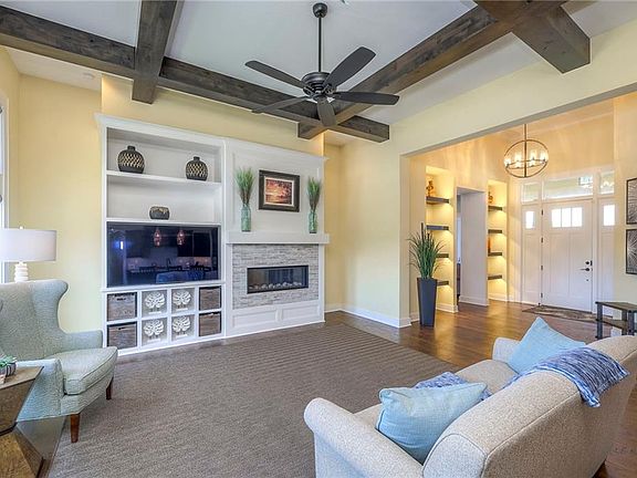This meticulously maintained reverse 1.5-story home offers an ideal floor plan for both everyday living and entertaining. The main level features a spacious primary suite, two additional bedrooms, and a versatile flex room perfect for a home office, sitting area, or playroom. The living room showcases wood-beamed ceilings, a cozy fireplace, built-in shelves, and remote-controlled window blinds for added comfort.