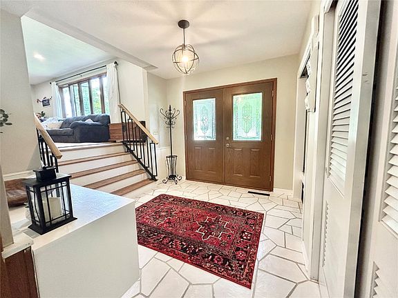 This spacious split-level home offers a private, wooded deep lot (approximately 0.45 acres). It features 4 bedrooms, 2.5 baths, skylights, vaulted ceilings, a stone wall in the family room, a freestanding fireplace, and a cozy library nook with wood and tile flooring. The kitchen is a chef's dream, boasting beautiful and spacious countertops, cabinets, and ample storage space.