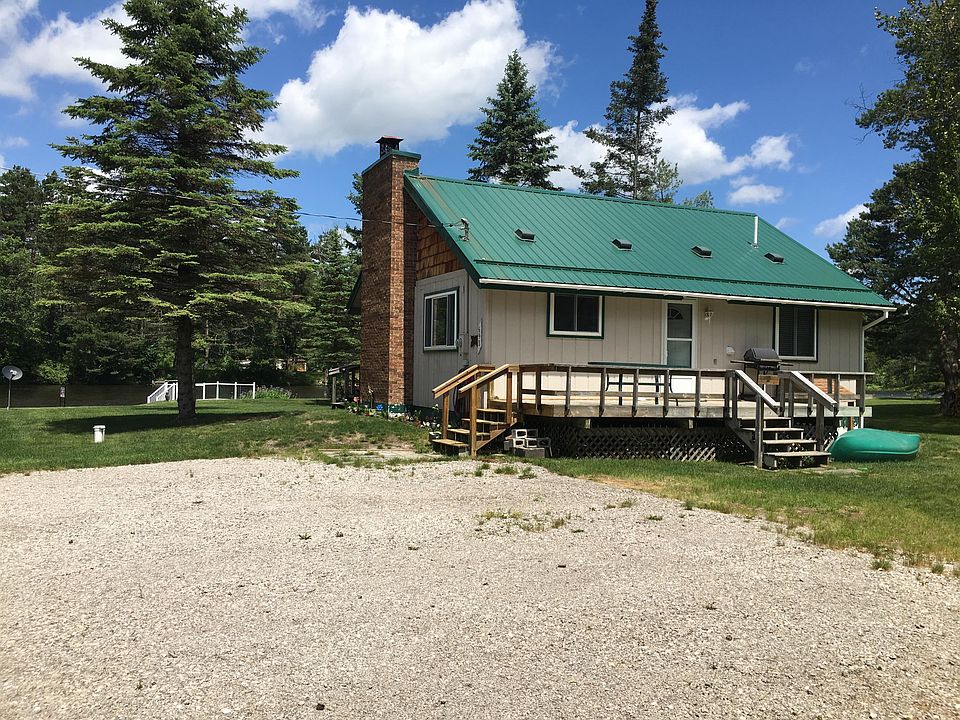 RIVERFRONT HOME-115 feet of frontage on this 2 bedroom, 1 bath chalet on the famous AuSable River. Recent updates include steel roof, new septic, new well, new windows, new dock and a remodeled bathroom and. kitchen. Stone fireplace with cathedral ceilings and view right from your door wall from your master bedroom and living room. Beautiful riverfront home. $ 159,900 D-409