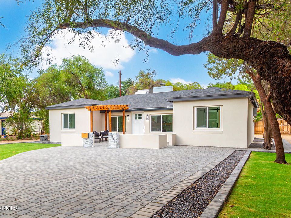 The search is finally over! Discover this captivating 3-bed, 2-bath residence in a large corner lot! Featuring a well-kept lawn, attractive pavers, and a welcoming courtyard with a stylish Ramada. Inside, the living room offers a soothing palette, recessed lighting, durable tile flooring, and a cozy fireplace for relaxing evenings. The eat-in kitchen is equipped with quartz counters, white shaker cabinets, stainless steel appliances, and sliding doors leading to the backyard for seamless indoor-outdoor living. The cozy main bedroom includes an ensuite with dual sinks, a soaking tub, a designer tile shower, and a spacious closet. Venture outside to a covered patio and an oversized backyard, perfect for crafting your dream oasis. This value won't disappoint!