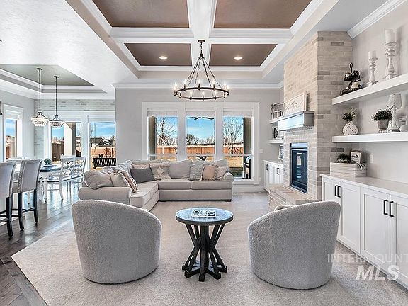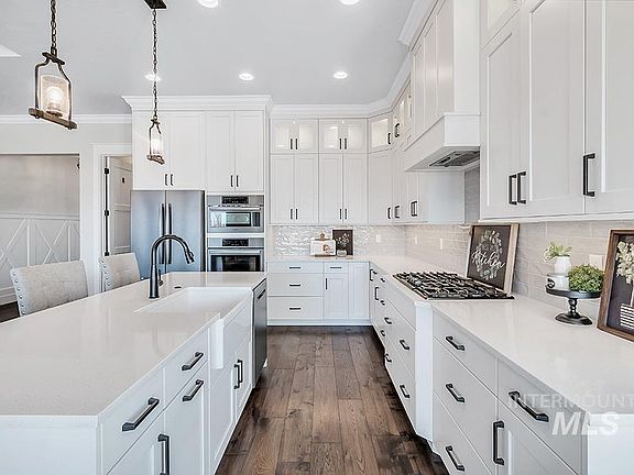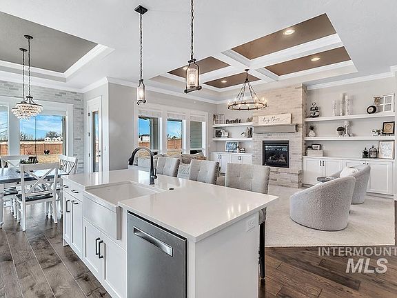 A custom-built single-level that marks a refreshing focus on modern-day living! This Eagle home showcases extraordinary craftsmanship & attention to detail, designed & built by Todd Campbell Custom Homes. The modern farmhouse aesthetic evokes a feeling that is comfortable, inviting, & effortlessly fresh, paired with a flexible open floorplan where friends & family can gather inside & out. Tall ceilings, large windows with plantation shutters, & a light neutral palette make up the bright a& airy interior, complemented by the strength of brick, wood, & industrial finishes used throughout. The magazine-worthy gourmet kitchen is outfitted with sparkling quartz countertops, ceiling-height cabinetry, & a farmhouse sink with a touch faucet, balanced with distinct black stainless steel Bosch® appliances. A main-level office, bonus room (with views of Bogus Basin), message center, & three additional bedrooms provide plenty of quiet places to retreat to, each featuring their own balance of style & unction.