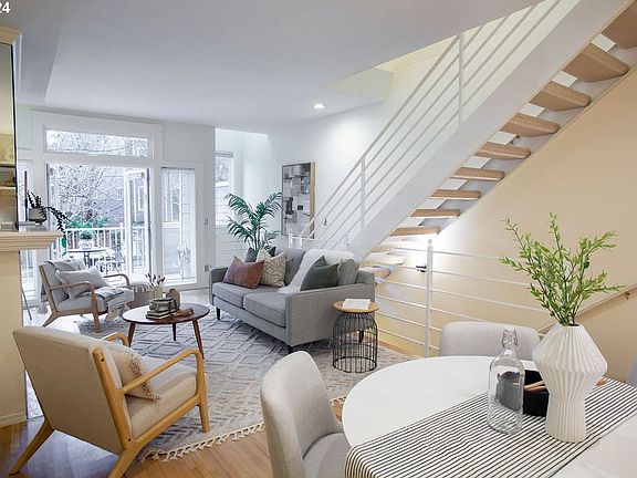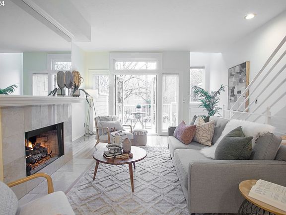 In the Heart of NW/Slabtown enjoy your own Parisian feel townhouse filled with sunshine from oversized south facing French doors. Up above the street, the front terrace is perfect to dine/relax & watch the city go by. High ceilings, skylights, light oak floors, open staircase, fireplace, contribute to the pleasant feel. Flexible main level floorplan w/dining area, built-in bookcases, powder room, open updated kitchen w/marble quartz counters, eating bar, pantry(!) plus French door to balcony w/spiral staircase to private backyard & Jacuzzi. Upstairs are two spacious full bath bedroom suites, vaulted ceilings, great closets, & convenient full size laundry. Drive-in attached, extra deep garage w/space to develop bonus rm, studio, exceptional storage. New A/C. Very well run HOA. Step outside & enjoy tremendous amenities; Forest Park trails, tennis @ Wallace park, shopping, cafes, food carts, breweries, yoga studios, fine dining, night life, library, Friendly House Community Center, live theatre, movies, or hop on the street car. Nowhere in PDX as convenient and charming. You'll love it here! [Home Energy Score = 8. HES Report at https://rpt.greenbuildingregistry.com/hes/OR10234595]