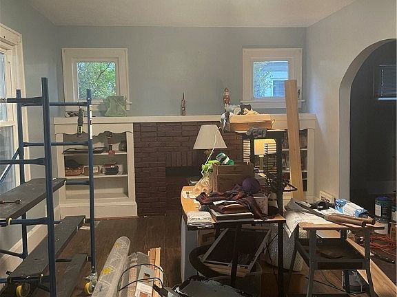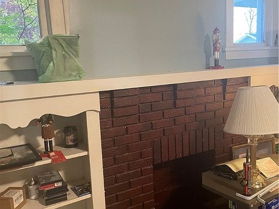 Kitchen cabinets are in good shape. Stove and Fridge to stay. Carpet upstairs needs updated, bedrooms may need painted. Living room has decorative fireplace and built in cabinets. Shared Driveway, with ample parking in back .