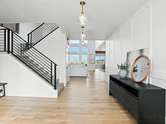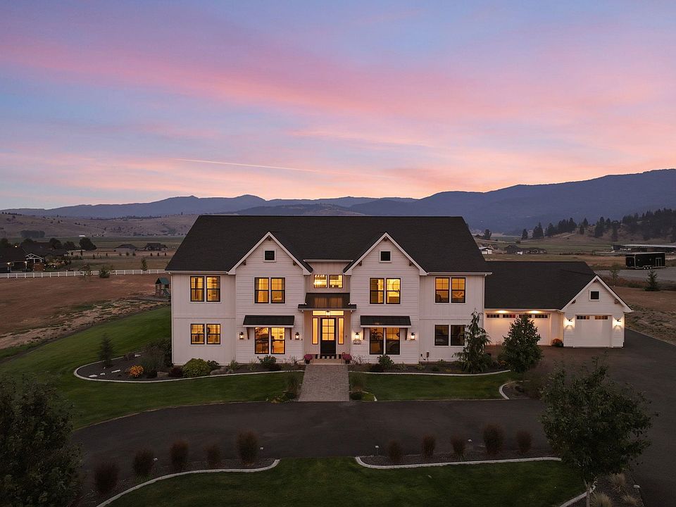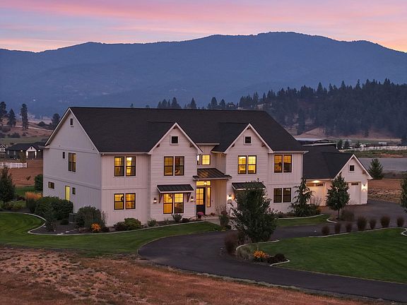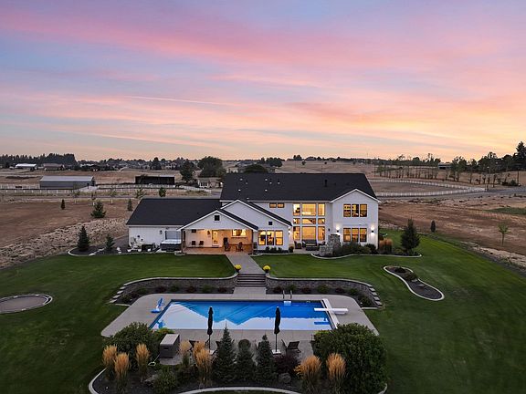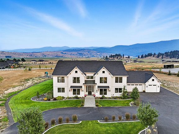 Located in sought-after Morrison Ranch, this casually elegant two-story modern farmhouse sits on five scenic acres with sweeping views of Mica Peak and the Saltese Uplands. The open two-story great room features a dramatic floor-to-ceiling fireplace, abundant natural light, and a chef's kitchen with double islands, beautiful custom cabinetry, and high-end appliances. The main floor offers a luxurious primary suite, den/office or music room, huge pantry, and mud room/drop zone. The upper level includes a spacious family/game room, workout area, four additional bedrooms each with an adjacent bathroom. A fully finished 4+ car garage offers room for 6 cars, workbench and abundant storage cabinets. The outdoor living spaces are equally impressive, showcasing expansive patios, custom fireplace w/pizza oven, a heated saltwater pool, in-ground trampoline, 30x50 fenced garden area, and play area. This home blends comfort, style, and functionality in a spectacular setting.