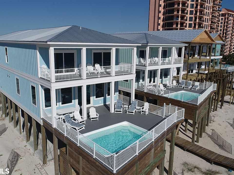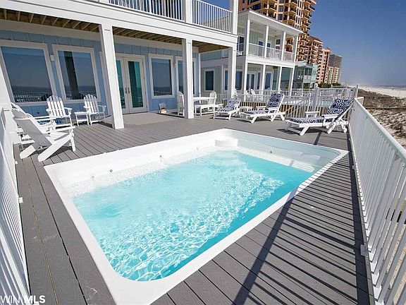 This 8 bedroom, 7.5 bath house sits directly on the white sands of Orange Beach with breath taking views of the Gulf of Mexico. The home is a raised 2 story coastal dream with cool and neutral colors throughout. Features of the home include Shiplap, high ceilings, beautiful granite counter tops, stainless steel, and LVP flooring. The home offers an elevator, security system, and a private pool on the deck that is seasonally heated. This is the perfect rental investment providing sleeping arrangements for up to 28 and enough parking space for 12 vehicles.