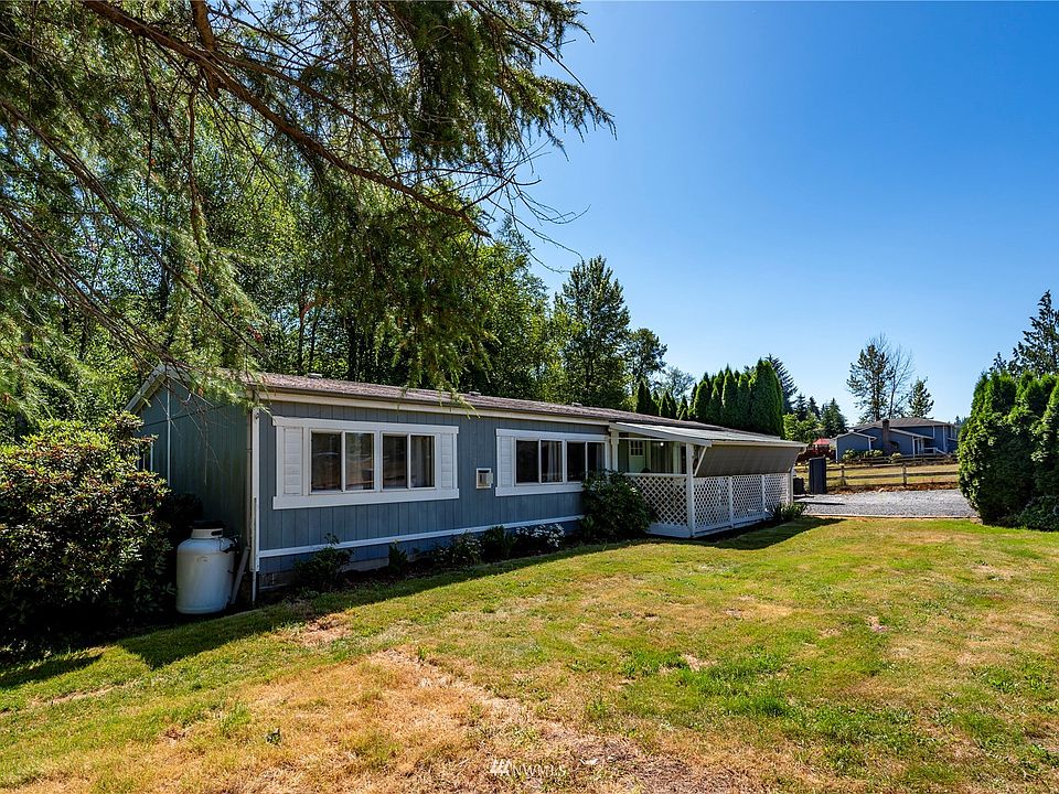 The best of both worlds...Country living within minutes of town! This centrally located manufactured home on just over 4.5 acres is in a prime location, just minutes from the City of Arlington, freeway access, the new Amazon facility, Angels of the Wind Casino and so much more BUT yet still private! Over 1500 sq ft of living space with new engineered hardwood flooring, new propane fireplace (voice command w/Alexa), new heat pump w/AC! Fully fenced front and side yard (beautiful new fence in front), firepit, storage sheds, RV parking with separate power box, private, dead-end road, the list goes on and on. Seller is offering $5K in concessions! Come make this house your HOME!!