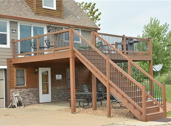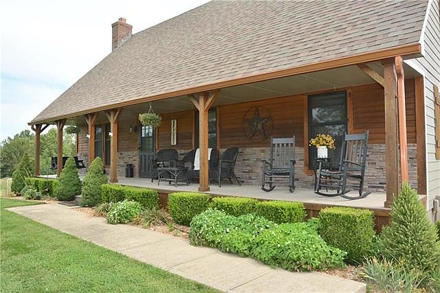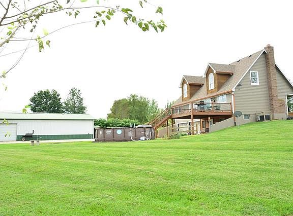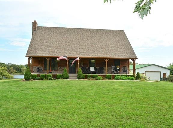 Spend the rest of your summer relaxing! Watch lovely sunrises & sunsets from deck, porch or patio. Enjoy fishing, canoeing or swimming in private lake of quiet neighborhood just outside Harrisonville. The trees are lovely, the front porch large, and you have 3.55 acres (m/l) to roam. Master suite is roomy w sitting area, his and her closets. 2nd bdrm shares access to main level Hollywood ba and has dble closet. Could function as 2nd master! Comfy finished basemt w fireplace. 30x50 insulated shop Large dining room. Great updated kitchen: Newly-painted cabinets are exquisite. Custom lighting throughout the home. Basement area is large enough for potential 4th nonconforming bedroom. Newly stained deck. Large shop has concrete floor, electricity, and a wood burning stove.
