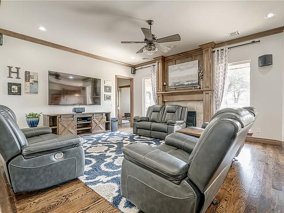 Don't miss this GEM! Loads of natural light in this open concept home with 4bedrooms, 3 baths & the upstair theatre room is sure to please. The oversized lot, which backs to private acreage with horses, has a larger patio, in-ground storm shelter, storage building & country views that are amazing. Crown molding throughout, newer carpet (July 2021) bedrooms, newer HVAC system (Main 2020) & a kitchen with large island, granite countertops, pantry & a built in breakfast nook/bench with more than enough seating & storage. The very inviting master has large, beautiful, chandelier & master bath has double vanity, walk in shower & lots of built ins in master closet. Once upstairs you can enjoy the theatre room with built in bar & a large bonus hidden storage closet. Private, no outlet street, yet close to highways, shopping, parks, & schools. Don't miss this one!