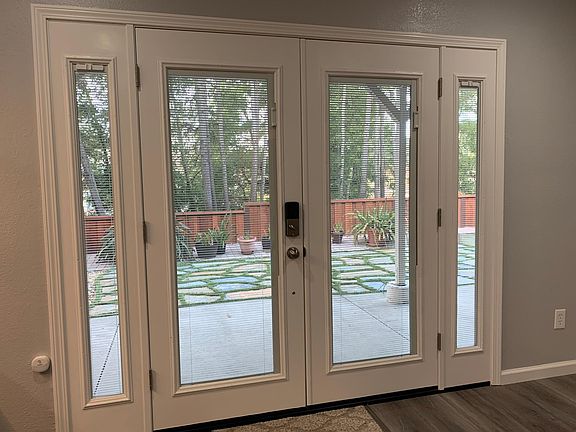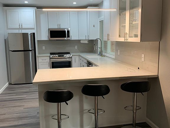 This new 2 bedroom, 1 bath unit is located atop Castro Valley's picturesque west ridge and only a short stroll to beautiful Lake Chabot's trails, boating, picnic, and camping sites. The unit features French doors that open to the lounge and adjacent kitchen. The kitchen features new full size stainless steel appliances, refrigerator, range (with induction cook top), dishwasher, garbage disposal, quartz countertops, and recessed dimmable lighting. There are vinyl floor tiles throughout. Each bedroom measures about 12' x 10'. Main bedroom has walk-in closet and is adjacent to the bathroom. Second bedroom has a closet with sliding doors. The unit has its own laundry room complete with new full sized washer and dryer, sink, and storage cabinets. The bathroom has double sinks and a separate water closet/bathtub/shower room. Between the main bedroom and bathroom are built-in linen/storage cabinets.