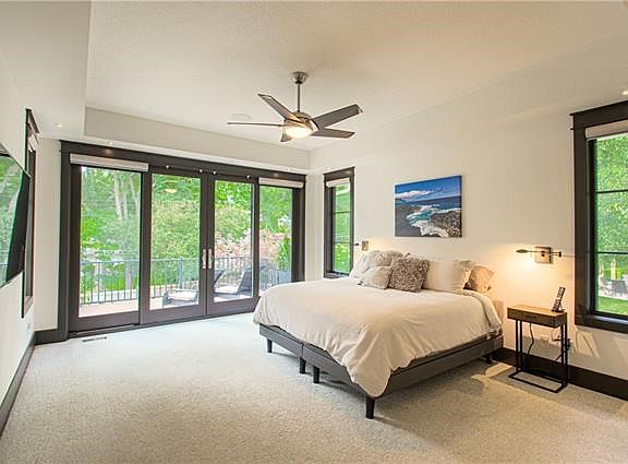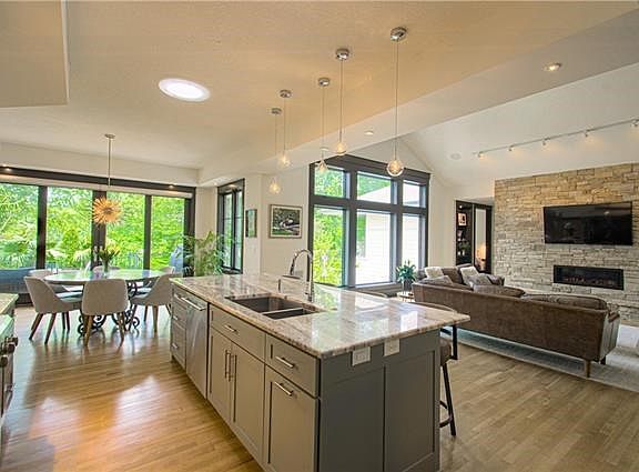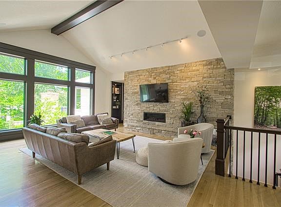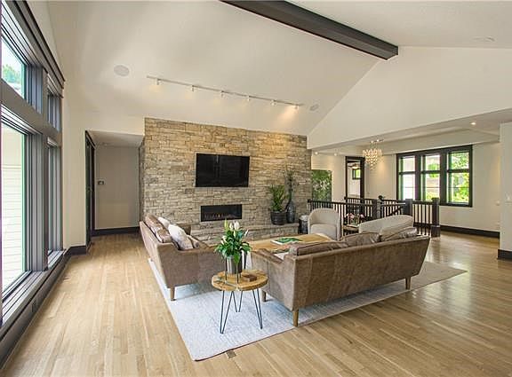 Extraordinary custom home in Old Leawood! Soft contemporary reverse 1.5 story built in 2015 with all the amenities. Natural light flows from the floor to ceiling windows from the moment you walk through the front door. Enjoy entertaining in this open concept main level that features a gorgeous stone fireplace, kitchen with upscale finishes including Greek marble, professional range hood, stainless appliances and wine chiller. The dining area leads out to the back deck and relaxing outdoor setting with lush new landscaping. Primary bedroom and bath are a dream with a private deck, Thermomasseur Air soaking tub, heated floors, walk in shower, dual vanities, large walk-in closet & attached laundry room. Enjoy gathering in the lower level with a wet bar, double drawer refrigerator, dishwasher, room for games & a cozy family room. The lower level walks out to an impressive stone wood burning fireplace, patio and hot tub. This home also includes a 3-car tandem garage with epoxy finish, and Elan a/v system throughout the home. Don't miss this unique home with so many spaces for entertaining and relaxing!