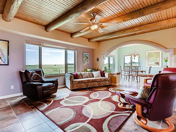 Well maintained spotless and Sunny Southwestern Style Ranch home. All one level living with low maintenance tile floors. Lovely flower garden in front of your western facing covered porch. You can even see the mountains from your kitchen window! Great designer touches like archways, exposed wood beam ceiling, glass brick shower, skylights, and huge picture windows. Master suite has connected office and there are 2 additional bedrooms. Space is used very efficiently in this house. Black top driveway and 3 car garage. Barn is clean! 4 stalls and turnout for each stall. House sits on 40 level acres with water rights so you can have crops or livestock - no water worries here. Easy access to State Highway 83 to travel to Denver or Colorado Springs. It would easily cost over $700,000 to build this house today. So take advantage of this discounted price!