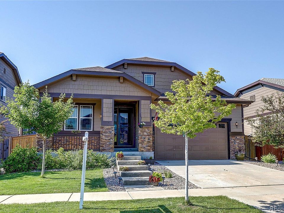 This stunning, like new ranch-style home offers the perfect blend of comfort, privacy, and modern style—ideal for multi-generational living with two Primary Bedroom and Bathroom Suites. The main level features beautiful wood floors throughout the living areas, expansive ceilings, three well-sized bedrooms—including a private primary suite with its own bath and large walk-in closet—and an inviting open-concept flow. The on-trend kitchen includes high-end granite countertops, newer appliances, gas stove, an abundance of rich cabinets, endless counter space and a breakfast bar that is open to a spacious family room perfect for everyday living or entertaining. The dining room is also open to the kitchen and could flex into an office space. Downstairs, the fully finished basement feels like a private home with a huge family/rec room and huge secondary primary suite with a spa-like bathroom featuring a Euro-glass shower, jetted jacuzzi tub, dual vanity sink, custom tile work, and a massive walk-in closet with custom built-in shelving. Out back, a covered patio provides privacy and shade, enclosed by tall wood fence for exceptional privacy for and a low-maintenance yard. **Brand New Roof installed** Whether you're hosting, relaxing, or creating a space that works for everyone under one roof, this home delivers comfort and versatility—all under one thoughtfully designed roof. Located in the highly desired master planned neighborhood "Traditions" with trails, several parks, coveted local schools and quick access to E-470 and a short drive to DIA. This warm spacious home has had one owner, loved and cared for and shows extremely well!