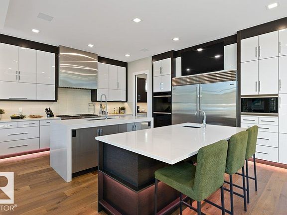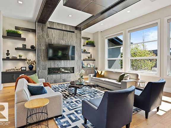 BREATHTAKING SHOWHOME in River’s Gate – Sturgeon County’s Only Gated Estate Community! This stunning great-room bungalow by Henderson Quality Building offers over 5000 SQFT of luxurious living space with a barrier-free layout & a 1600 SQFT 6-car garage with RV entrance. Features include custom millwork throughout, sun-drenched great room with stunning floor to ceiling feature fireplace, chef inspired kitchen with double quartz islands, floor-to-ceiling built-ins, Wolf & Sub-Zero appliances, & a butler’s pantry. Includes 5 bedrooms: a resort-style primary suite with 2-sided fireplace & SPA INSPIRED EN-SUITE , main floor guest room with en-suite, lower bedrooms with Jack & Jill bathroom. Basement boasts glass stairwell, theater room with 12-ft screen, tiered seating, wet bars, games room, & more. Outside features $200K in serenity landscaping package, covered BBQ center, EV charger, motorized blinds, smart home automation, & 9-camera security. Unmatched quality, design, and elegance! In a word SPECTACULAR