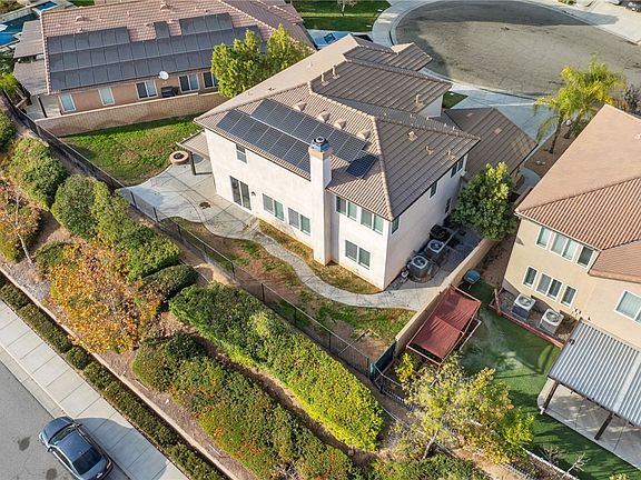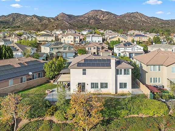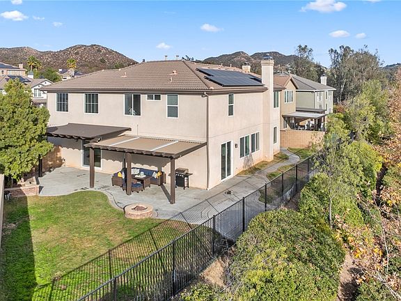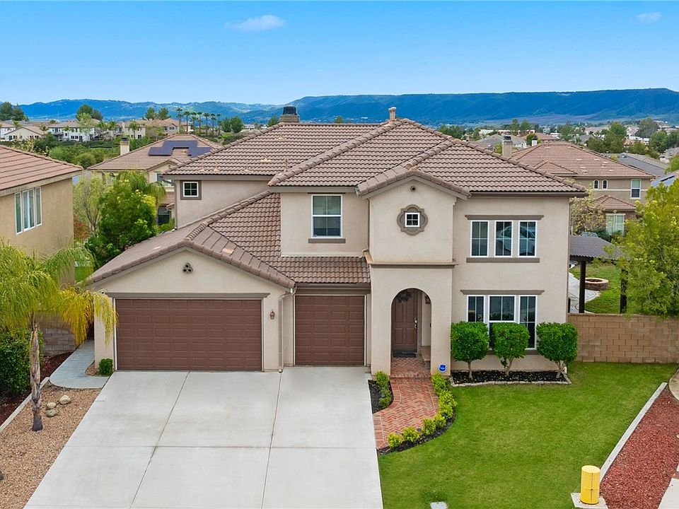 Welcome to 25125 Cedar Ridge, a stunning two-story solar powered home in the serene Estrella Hills community of Wildomar. Nestled in a peaceful cul-de-sac, this expansive residence offers 5 bd, 3 ba, 2,876 sq. ft. of living space on a premium 10,018 sq. ft. lot, 3 car garage. The exterior of the home is beautifully designed with Spanish tile accents, inviting entry door, with decorative brickwork walkway illuminated by solar landscaping lights. The private backyard is an entertainer's dream, no rear neighbors, view, lush, green hillside backdrop, fire pit, stamped concrete, and a combination of covered and uncovered patio areas provide plenty of space to relax or host gatherings. The yard also features a tranquil rock-style water feature and is bordered by block walls on both sides for added privacy. With solar panels fully paid off, this home is as efficient as it is inviting. Inside the home you will find vaulted ceilings, plantation shutters, and an open floor plan. Neutral tile flooring extends throughout the first level, complemented by recessed lighting and a stone fireplace in the living room. The kitchen is a true centerpiece, featuring granite countertops, dark oak wood cabinets, stainless steel appliances, double oven, walk-in pantry and a stylish stone accent center island. A built-in wet bar complete with a kegerator, mini fridge, and wine rack enhances the home’s entertainment appeal. A spacious bedroom and bathroom with a walk-in shower are conveniently located on the first floor. The separate laundry room includes ample storage and open closet area. Upstairs, the remaining bedrooms feature vinyl flooring, high ceilings, and plantation shutters. The primary suite is a private retreat with a large walk-in closet, luxurious en-suite bathroom, soaking tub, dual sinks, separate shower, and vanity area. The secondary upstairs bathroom includes dual sinks, shared shower, providing functionality for the additional bedrooms. This home is equipped with dual AC units, ceiling fans, and abundant built-in cabinetry. Sliding glass doors from the dining room open to the backyard. Located in the picturesque Temecula Valley area of Southern California, this property is a 15-minute drive from Temecula’s renowned wineries, shopping destinations, and recreational opportunities. With its lower tax rate and low HOA fees, this home offers exceptional value. Don’t miss the chance to call this extraordinary property your own. www.25125CedarRidgeCourt.com