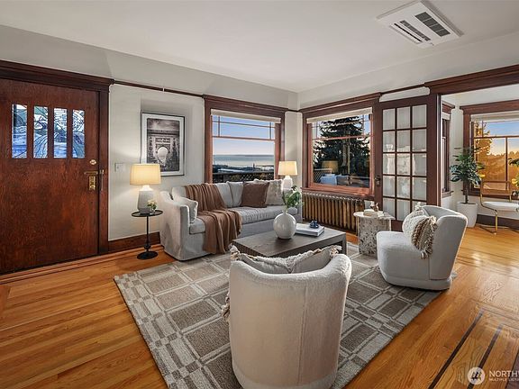 This Queen Anne craftsman perfectly balances original character with modern updates. Freshly refinished floors with rare mahogany inlay, leaded-glass built-ins, and engraved radiators showcase its timeless charm, while thoughtful upgrades—new kitchen, all new appliances, electrical, water heater, and EV charging—bring everyday ease. Comfort is covered with radiant heat plus a heat pump with mini-splits for even more efficient heating and AC. Western-facing windows flood the home in natural light and capture stunning sunsets over the Sound, complete with passing ferries. With a detached garage (DADU potential!) and close proximity to neighborhood parks and playgrounds, this is historic Seattle living, elevated for today.